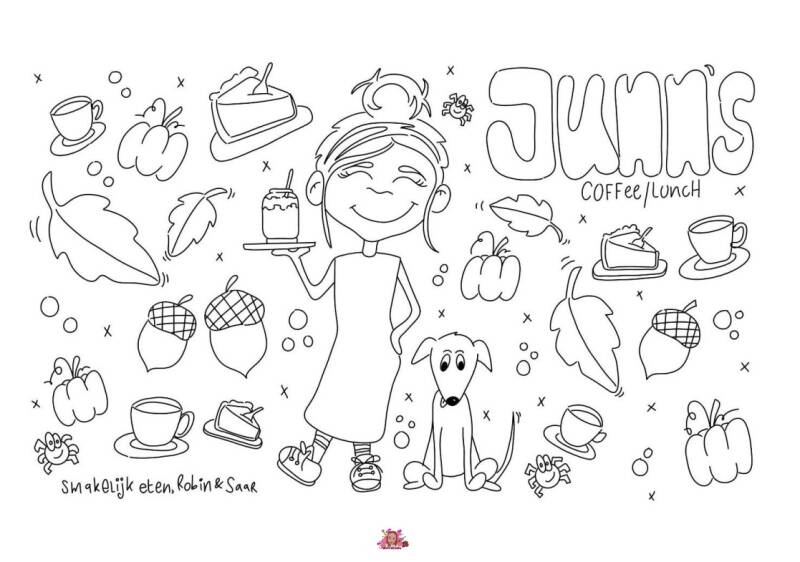Afgelopen week heb ik een nieuwe tekening ontworpen voor onze plaatselijke lunchroom. Eerder maakte ik al twee tekeningen voor haar, maar het nieuwe seizoen inspireerde mij en de vraag van een collega die zei: "Kun je ook haar hond maken?". Dat vond ik een hele leuke uitdaging omdat zij mij vertelde dat ze mijn tekening op het raam wilde laten terug komen voor het nieuwe seizoen. DE HERFST!